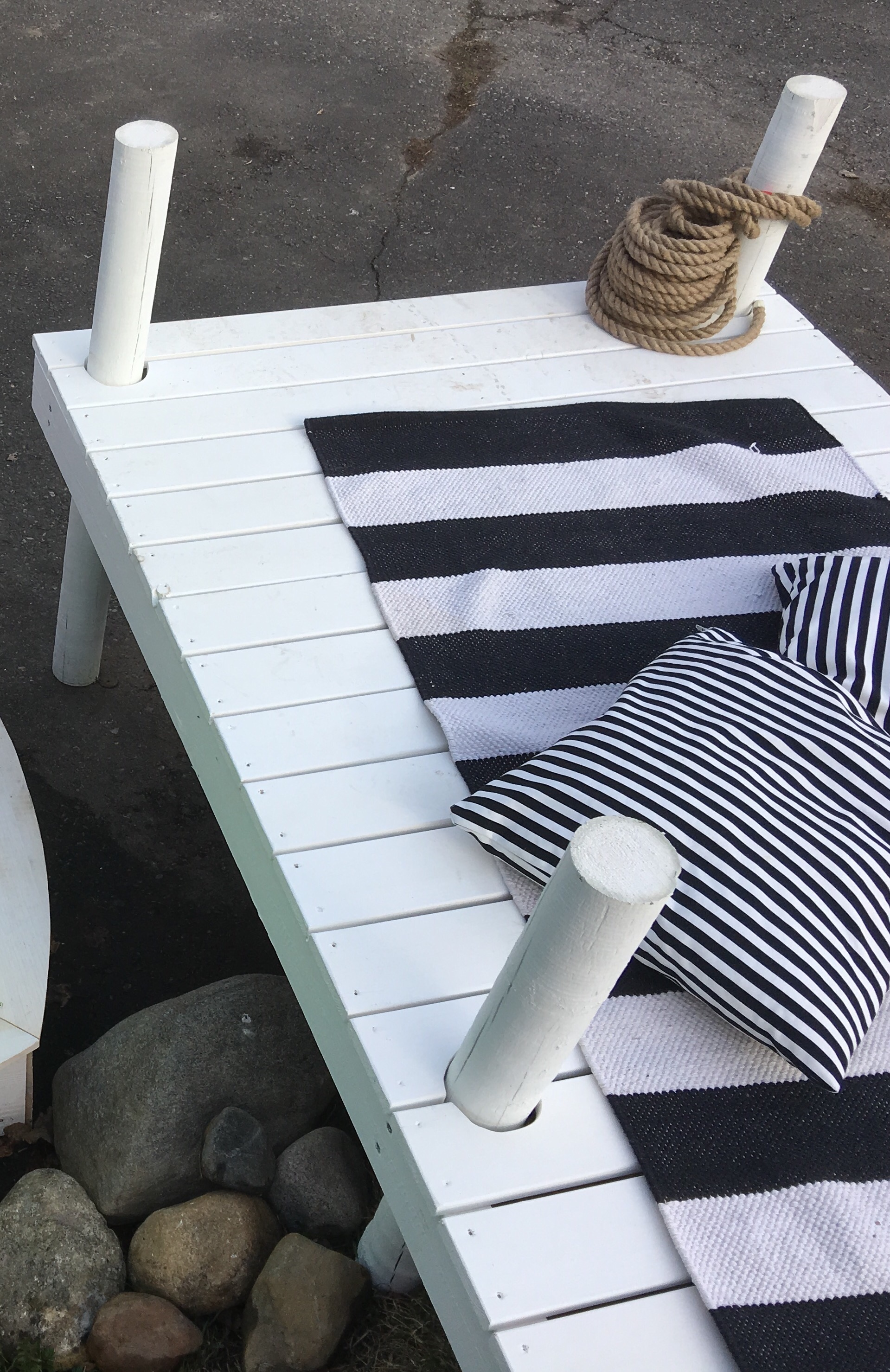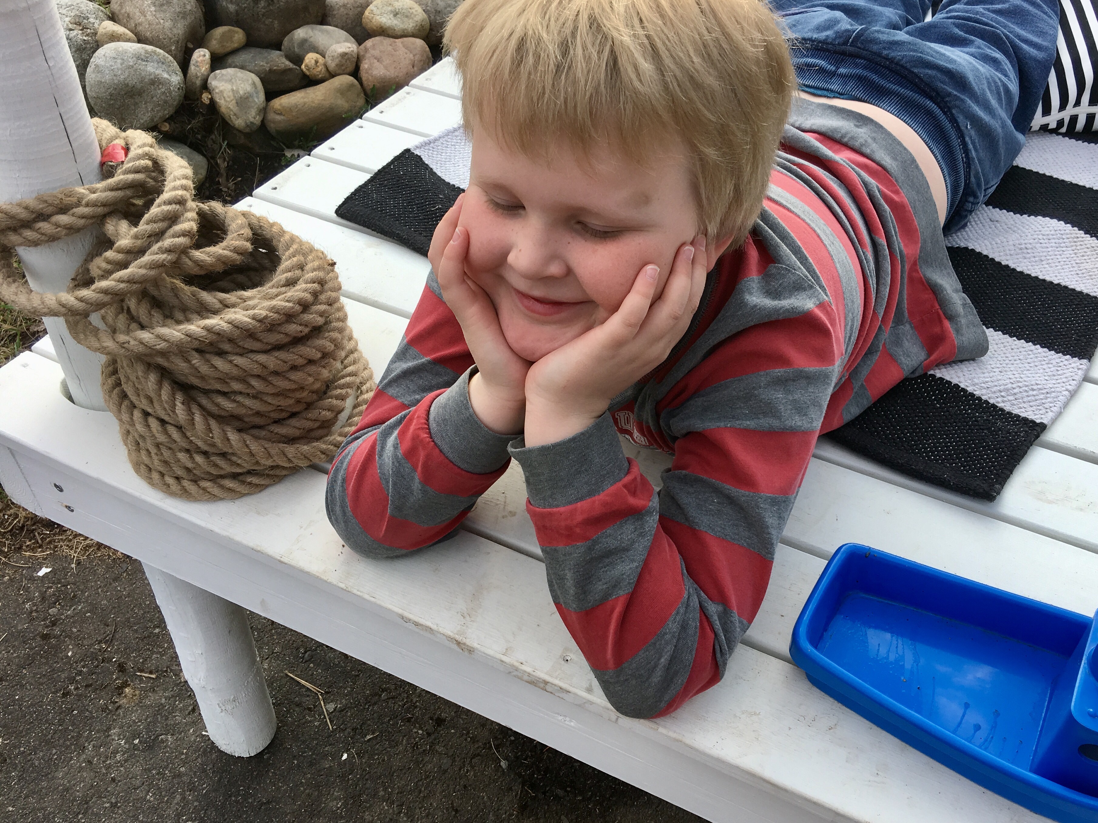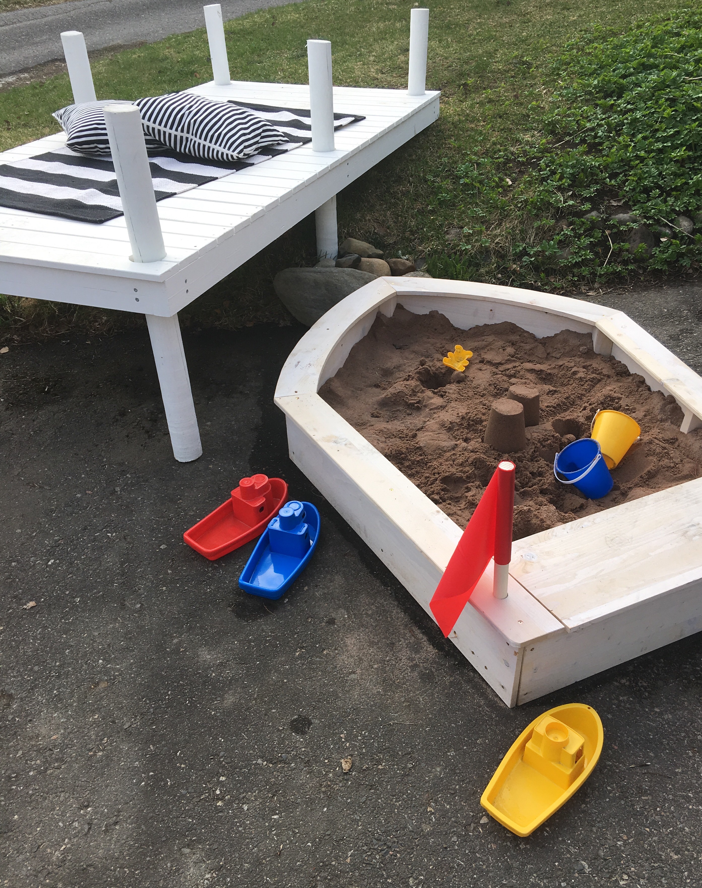 Ekan lämpimän illan kunniaksi otin viimein vähän pihakuvia! Laituri ilman vettä -projekti on miltei valmis eli tätä voi jo ilolla esitellä. Erityisesti pitää kiittää Pohjois-Karjalan ammattiopisto Outokummun lavasterakennuksen linjaa (ja opettaja Jari Paldania) avusta toteutuksen kanssa. Ei olisi itseltä onnistunut.. opiskelijoiden käsialaa on laituri ja pelastusrengas, hiekkis on ostettu Lekmerin nettikaupasta. Suunnitelmasta on toteuttamatta vielä pienet asvaltin sisällä uivat kalat, joita aurinkoisina kesäpäivinä sitten taiteilen..