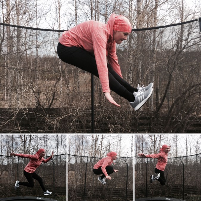 Hyppimisestä innostuneena menin myös trampalle, mutta voi noita surkastuneita lihaksia!!! Mistähän saisi motivaatiota vähän potkia itseä persiille, että saisi nollakunnon nousuun?