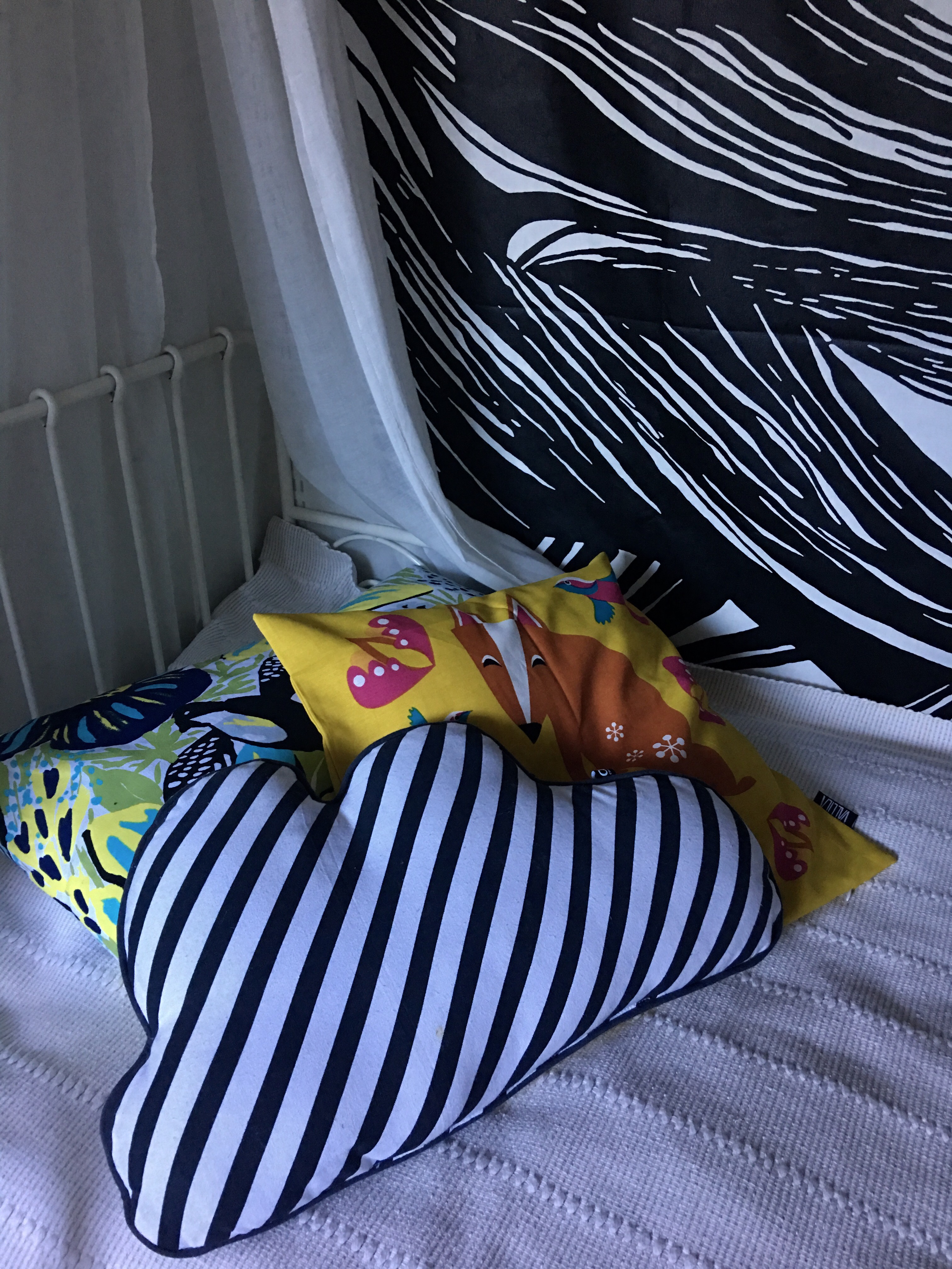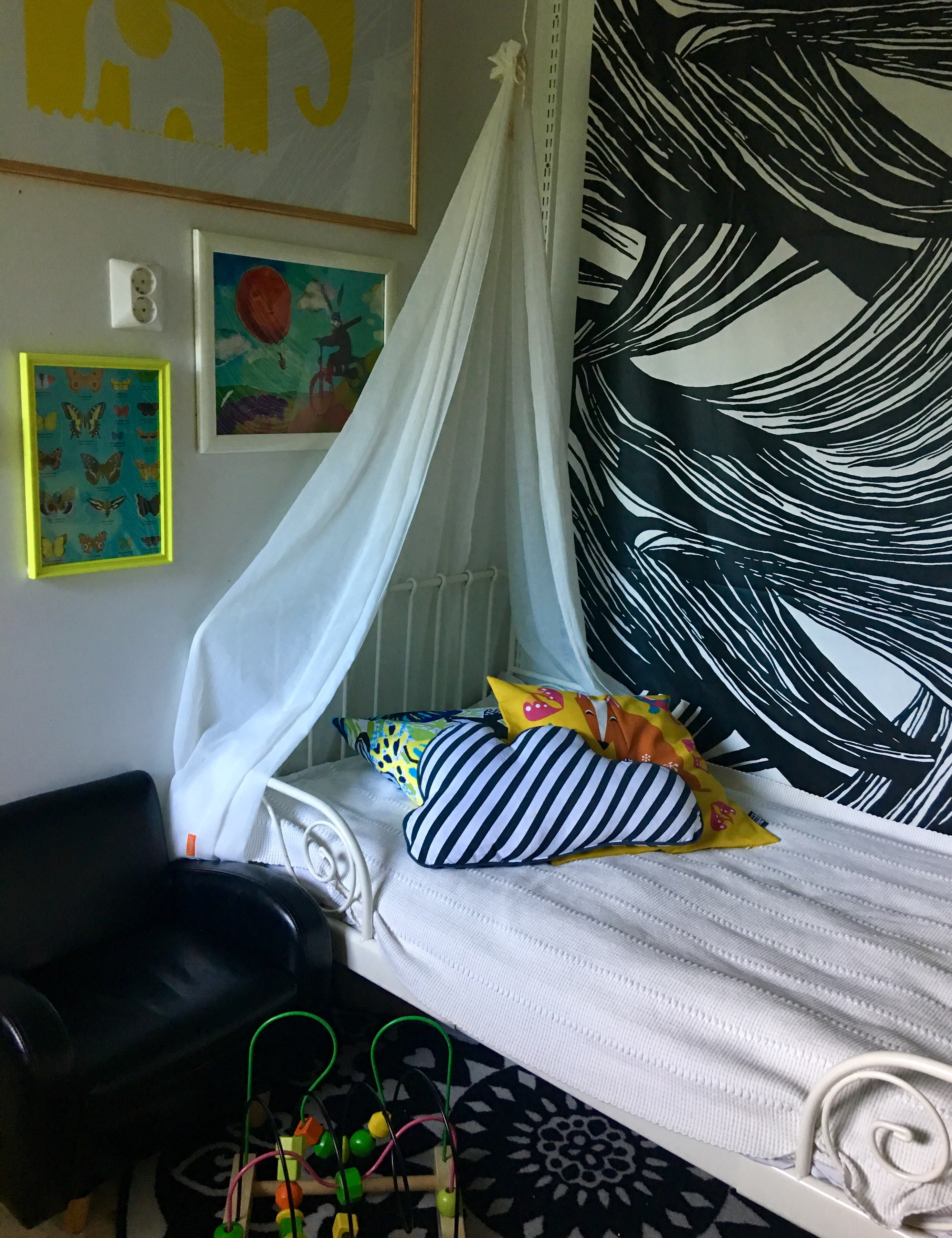 Aslan nurkan sain sunnuntai-iltaan melko hyvälle mallille hankkimalla vain keltaisen autokorin, seinälle Vallilan vahakangasliinan (jonka kiinnitin pyykkipojilla) ja pari tyynyä. Keräilin sieltä täältä kotoa sopivia kamoja ja huoneesta tuli sitten keltaisen ja turkoosin sekoitus!
