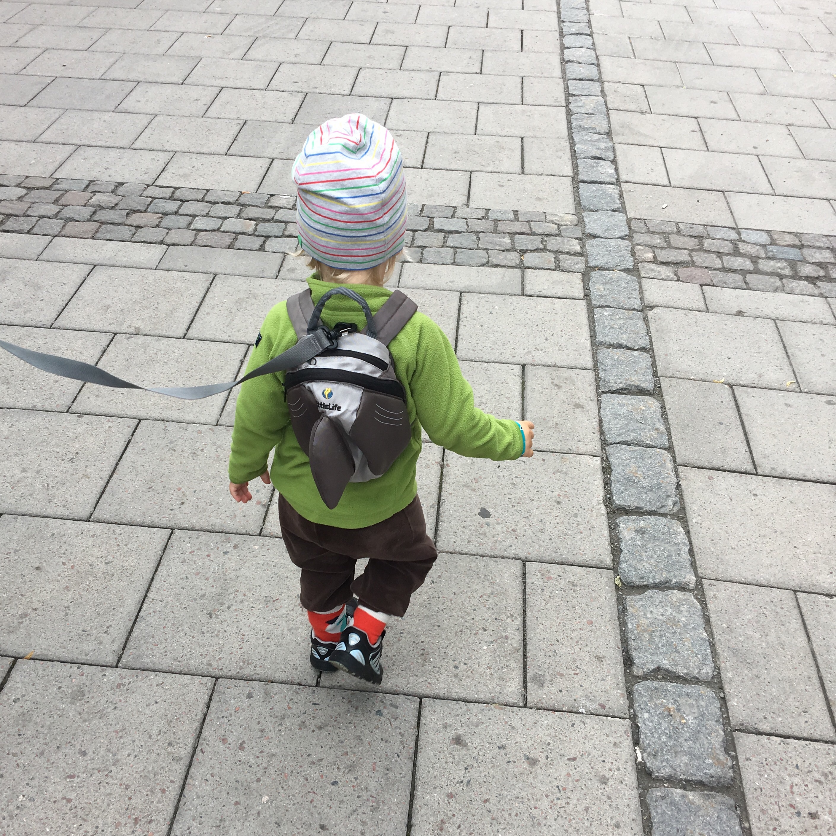 Asla matkustaa lähinnä rattaissa, mutta uskomatonta vapautta hänelle tarjoaa pikkuinen hai-reppu, jossa on talutushihna. Muutoin meno on varsin holtitonta, mutta hihna tuo hitusen turvallisuutta säntäilyyn! Suosittelen lämpimästi kaikille 1-3-vuotiaiden ryntäilyyn kyllästyneille!