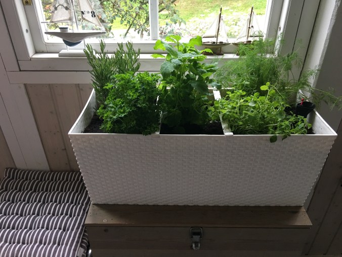 Aamun aloitin viimeistelemällä kuistille yrttilaatikon. (Toivottavasti näillä on pitempi elämä kuin ulkona kasvatetuilla, jotka hukkuivat)