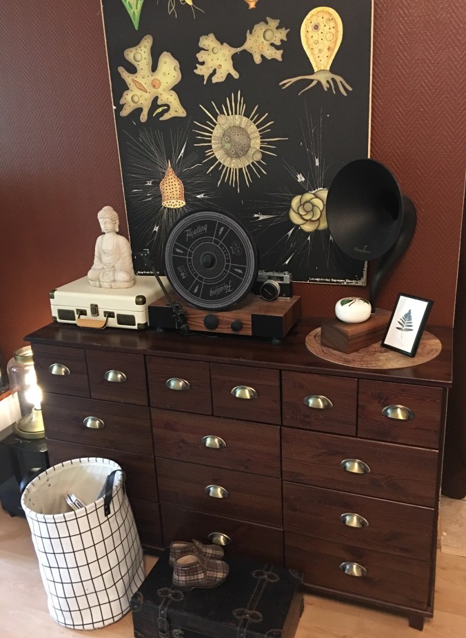 Ihana sisustus teillä, itsekin rakastan kaikkia tuollaisia purnukoita ja laatikoita! Olen siivouksen suhteen kamalan laiska, mutta koska toimistoni sijaitsee kotitalomme yhteydessä täällä Helsingissä joudun pitämään sen asiakkaiden takia todella siistinä. Oma koti onkin sitten hieman vastakohta. Onko tuo pelipöydän lamppu muuten itse tehty vai mistä olet sen hankkinut?