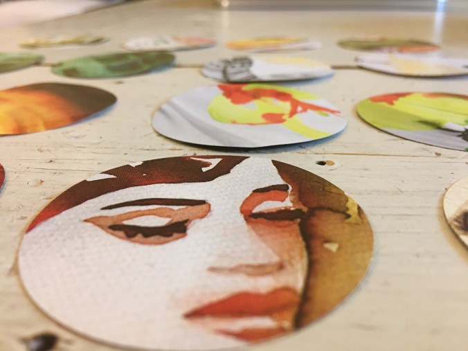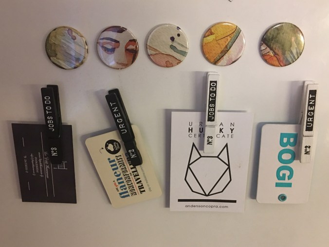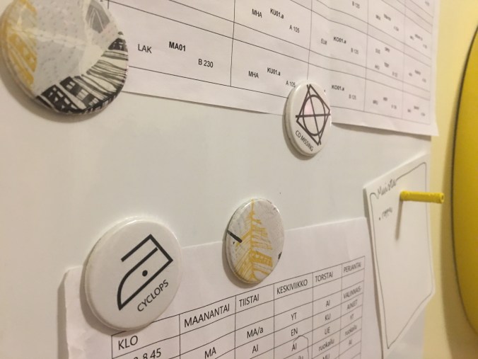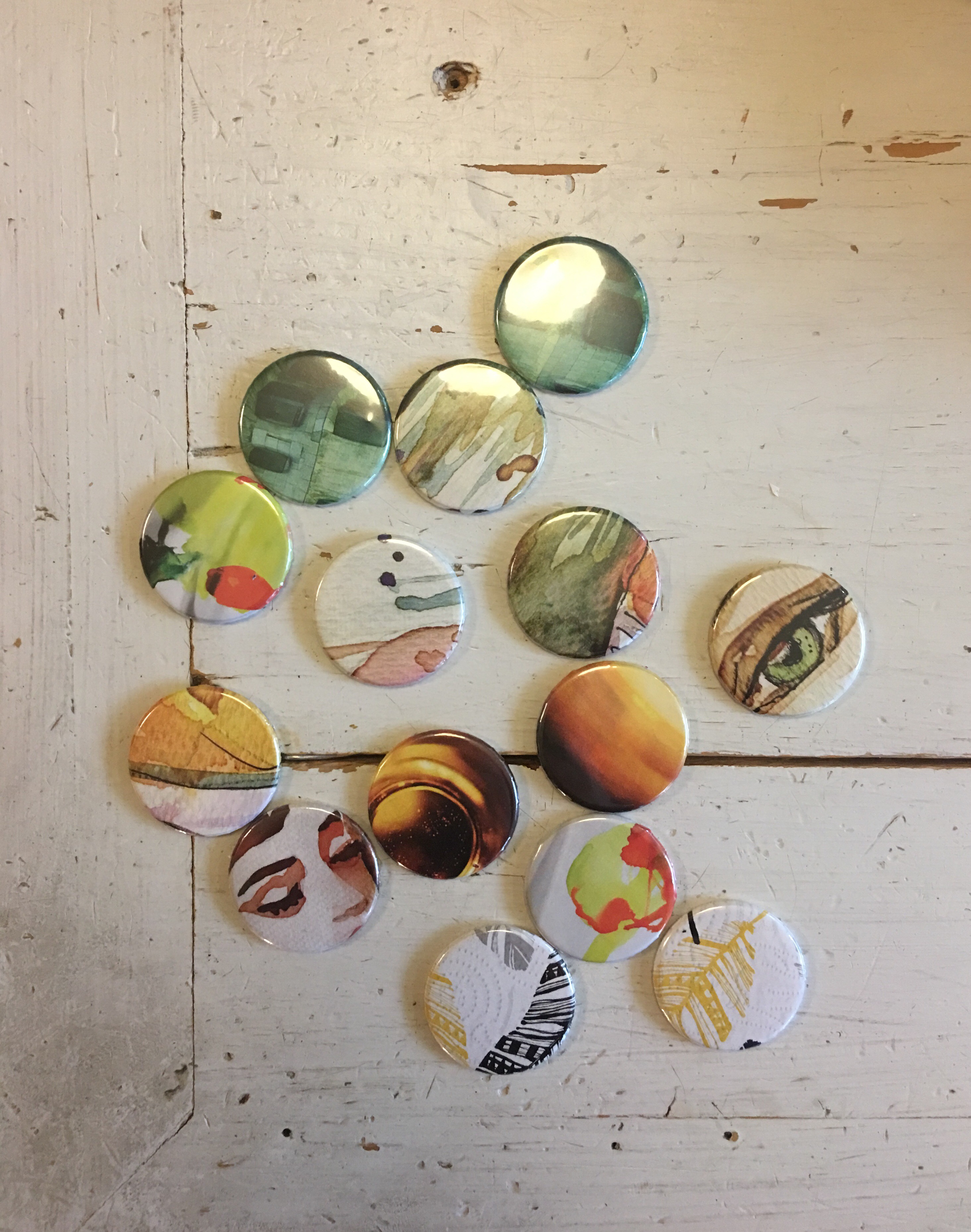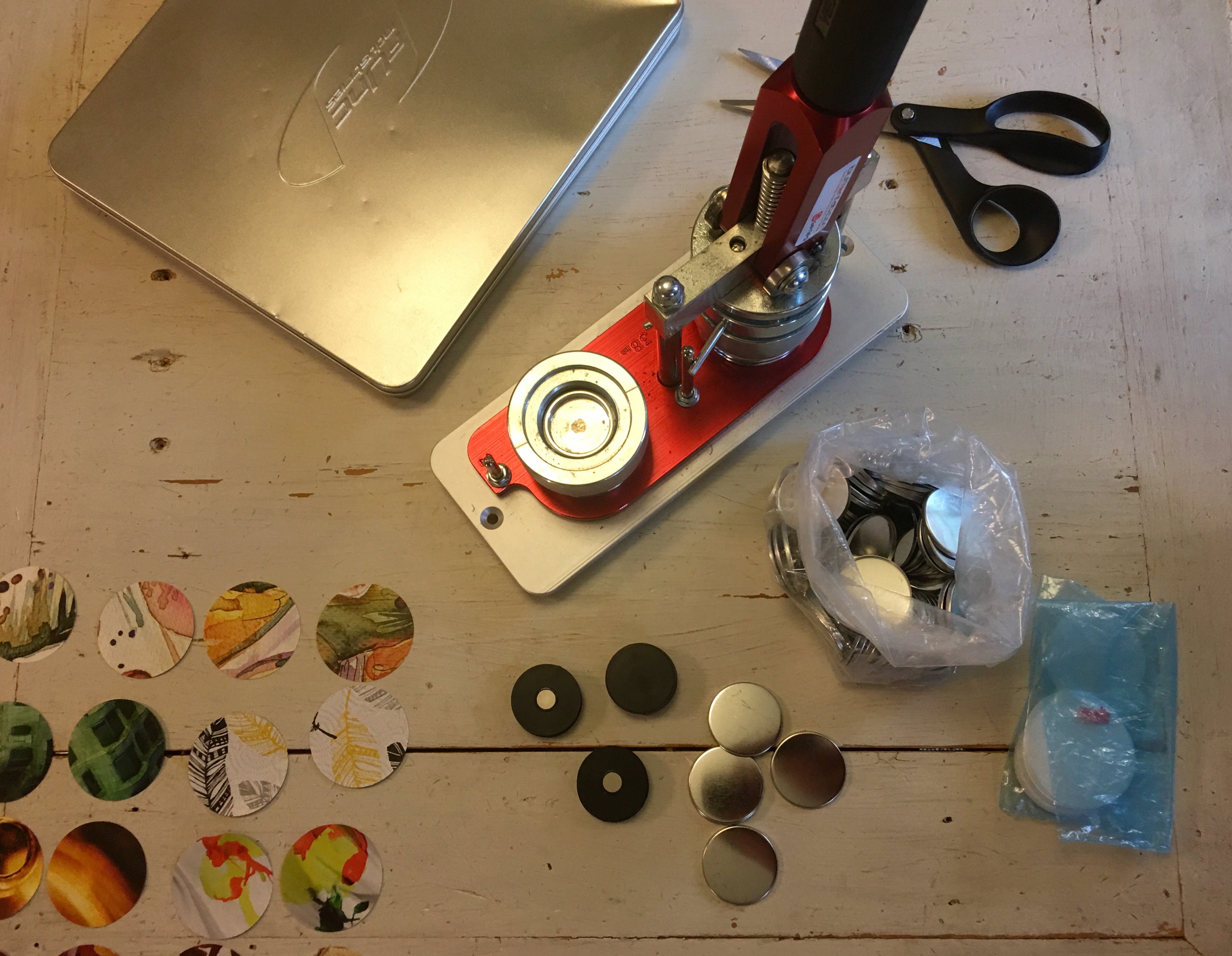 Autotallin perukoilta löytyi pinssikone! Se aina unohtuu ja hautautuu tavaravuoren alle. Puolivuosittain muistan, että se on olemassa.. Tällä kertaa sain inspiraation tehdä käyttöön ”taidemagneetteja”..