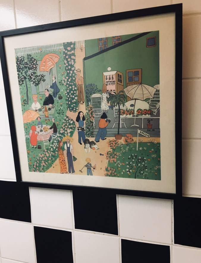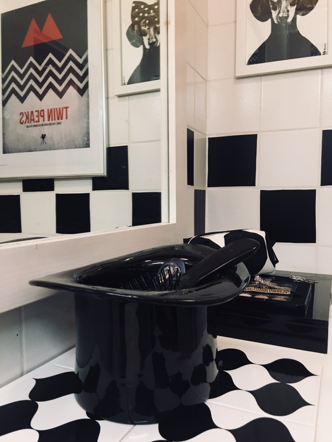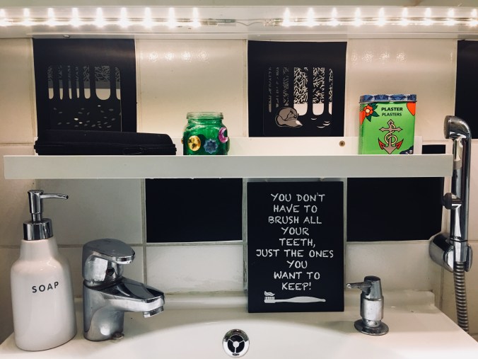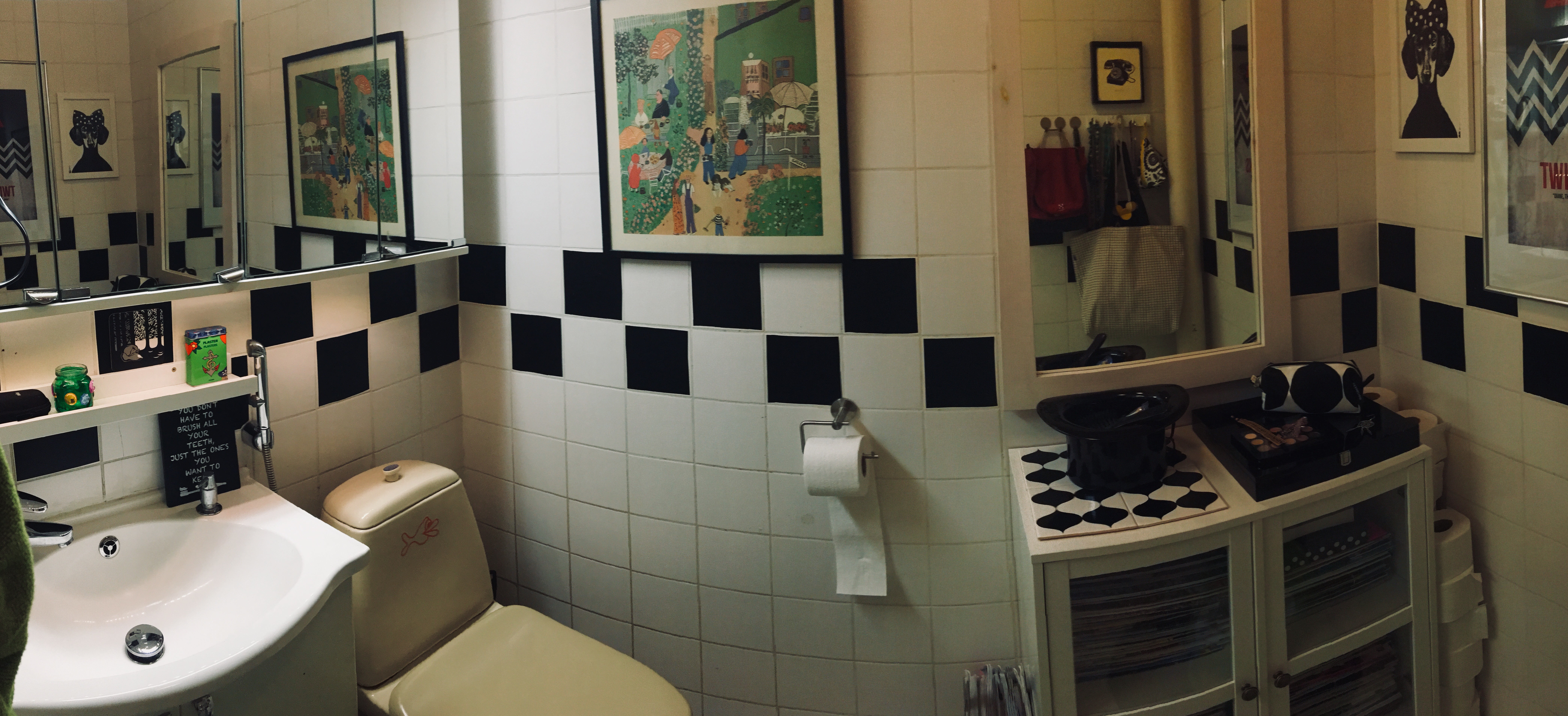 Vessaan päätyi siis kasa tauluja ja karseat glitterikaakelit peitin mustalla tarralla! Aika retro!