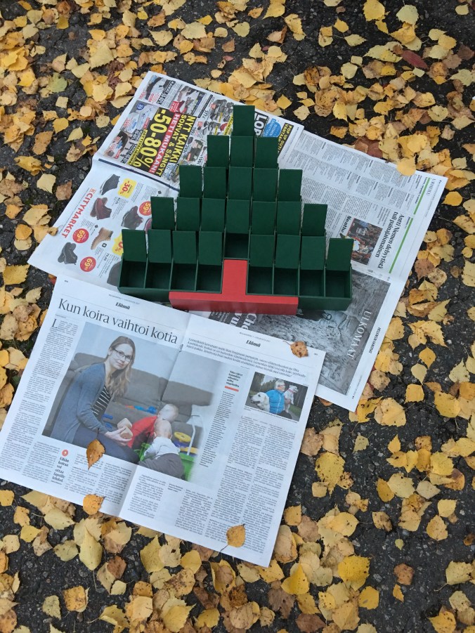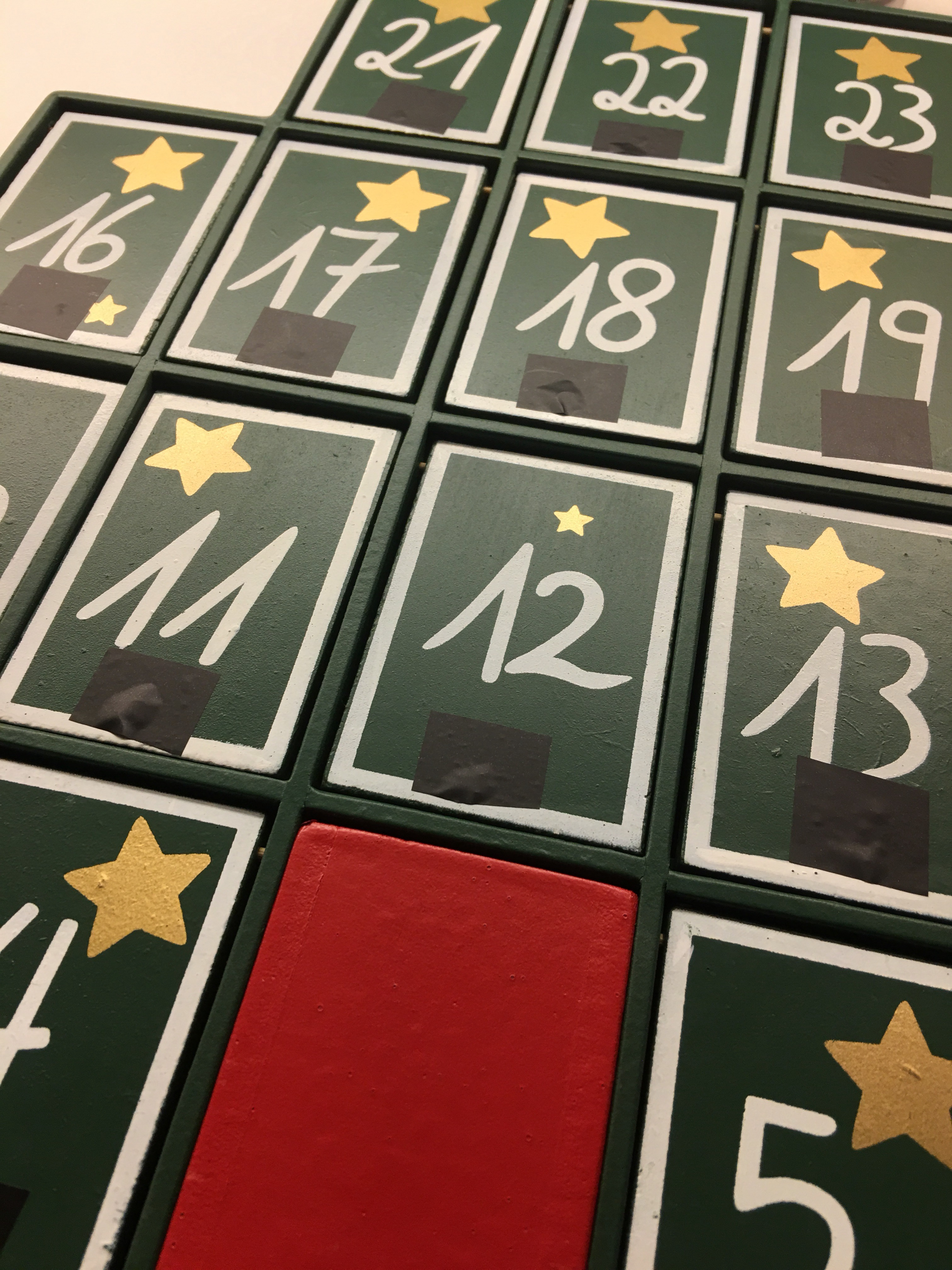 Ostin kirpparilta ruman puisen joulukalenterin, joka oli osittain rikki ja maalitkin hapertuneet. Tavoitteena oli antaa sille uutta loistoa hiukan tuunaamalla.