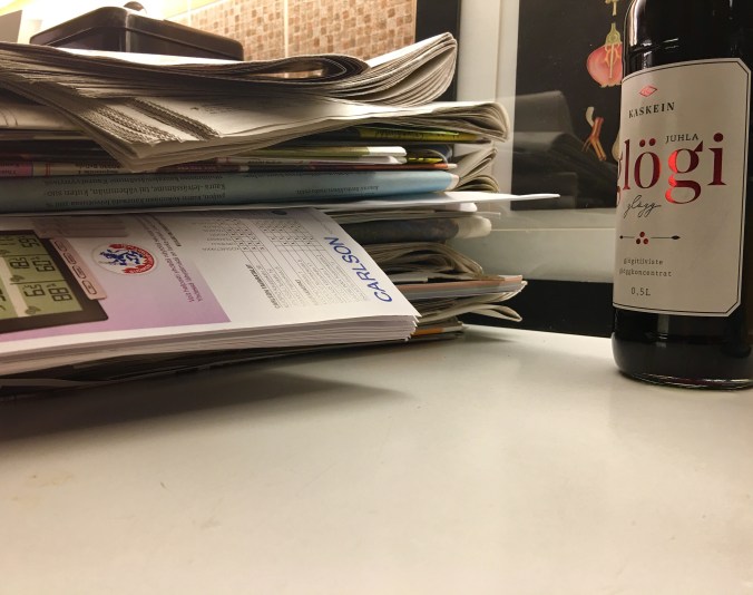 Kokeilin tätä perjantai-iltana ja kokeilu oli miellyttävä. Minun ei tarvinnut puunata ja kiillottaa. Voin olla. Lukea lehtiä. Pitää jalat pöydällä. Huomata kahvitahrojen muodostaman kuvion lehden sivulla. Jättää luetut lehdet röykkiöksi ihan mihin vain. Hoitaa sen vaikkapa vasta huomenna. (No vein kuitenkin lehdet ja pahvit, koska kierrätyspiste oli matkalla kauppaan…)