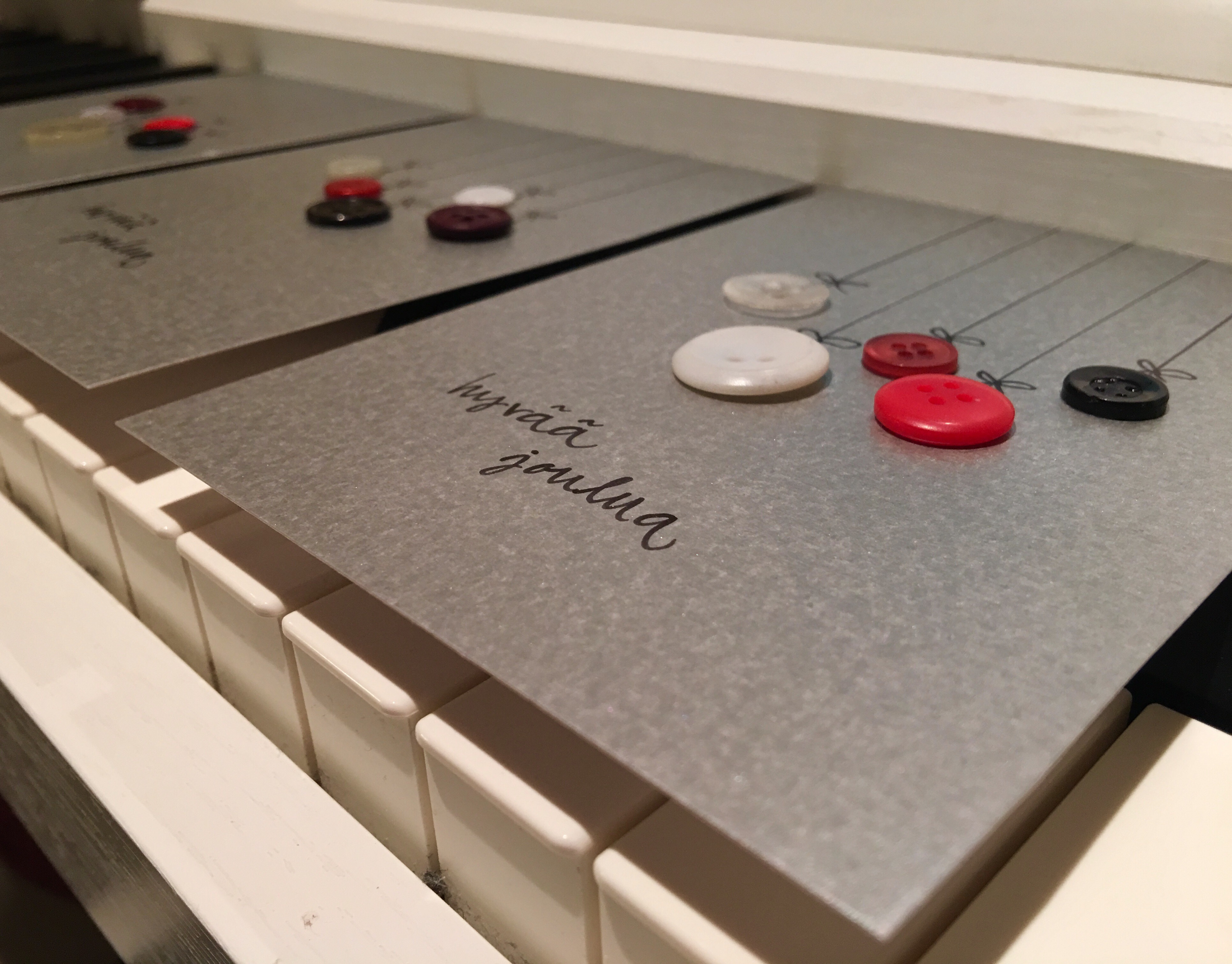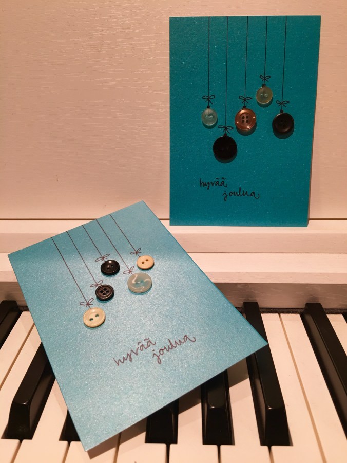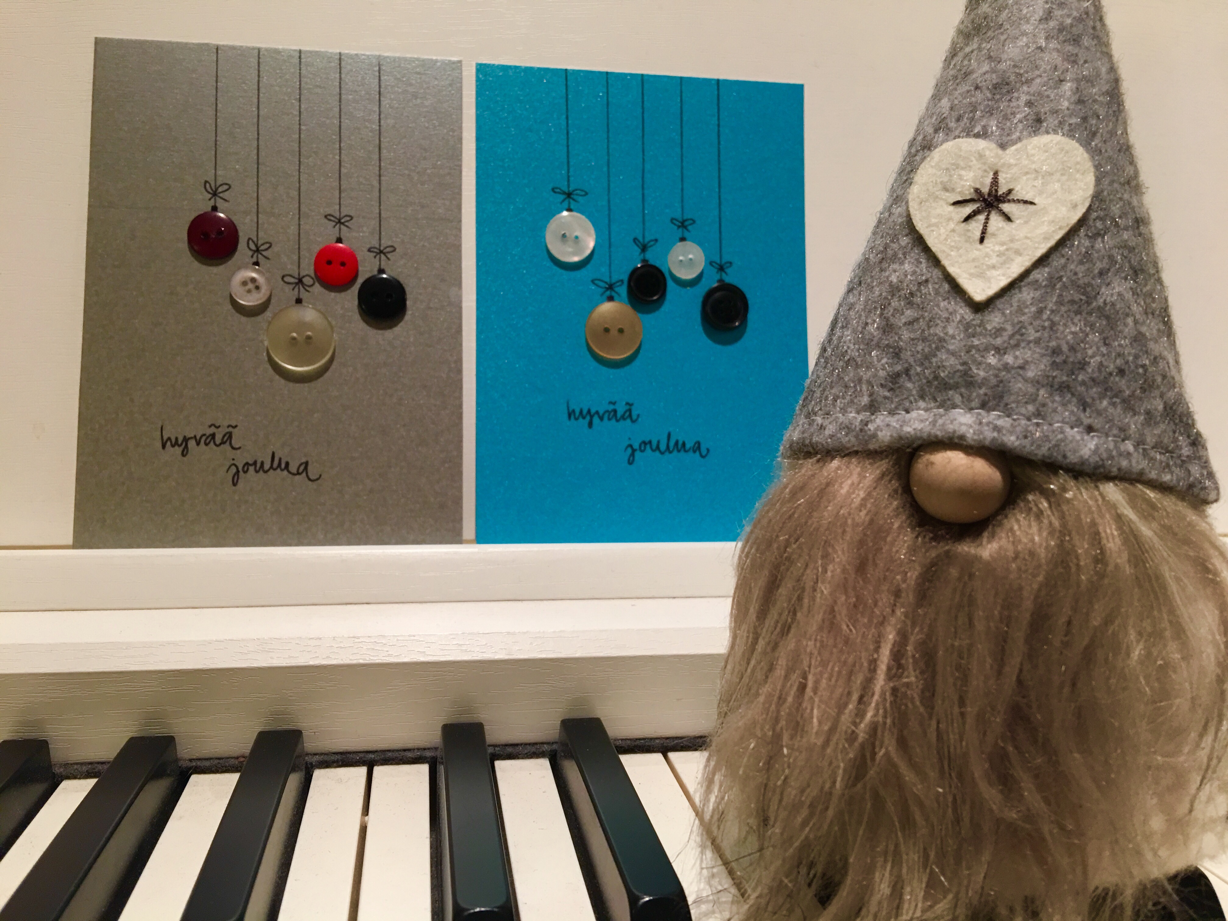 Joka kodista löytynee irtonappeja laatikoiden pohjalta. Ja muutapa ei sitten juuri tarvitakaan; korttipohja, liimaa ja musta tussi.