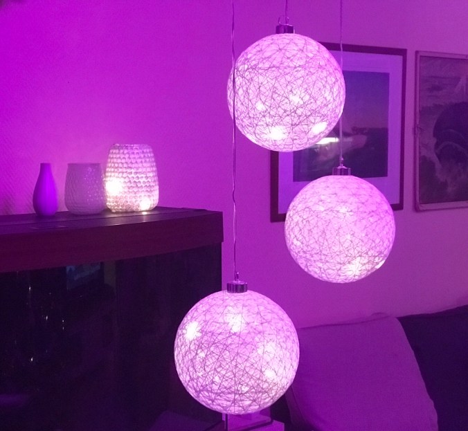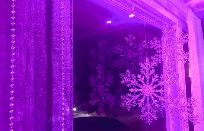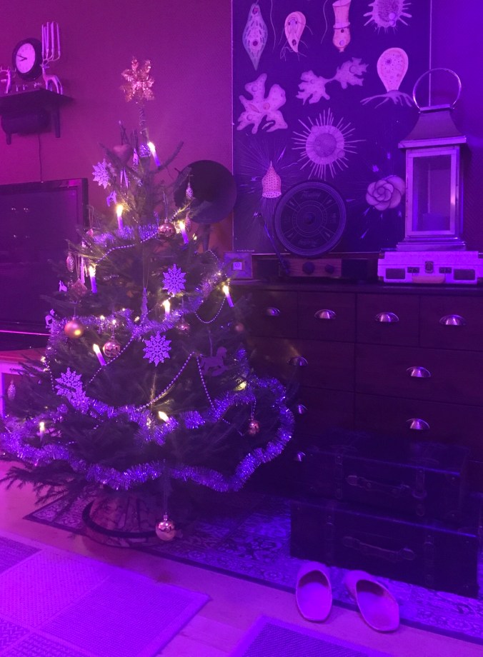 Kuvissa olohuone ja joulukuusi kera anteeksi antavan violetin hämyvalaistuksen…
