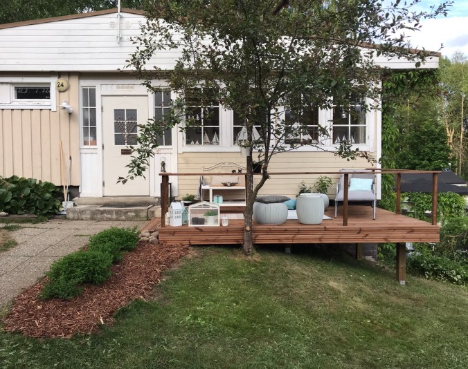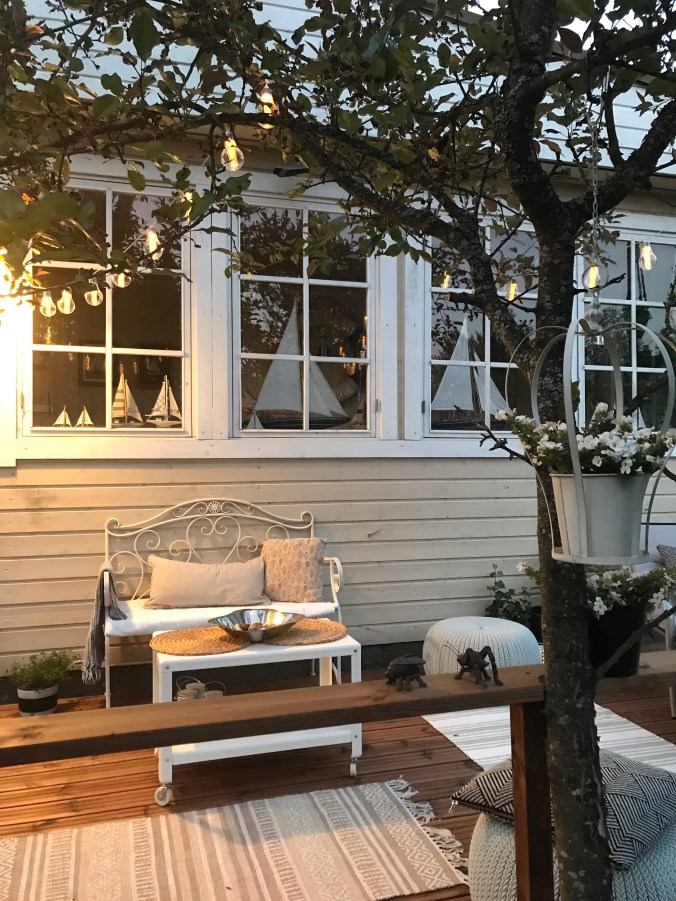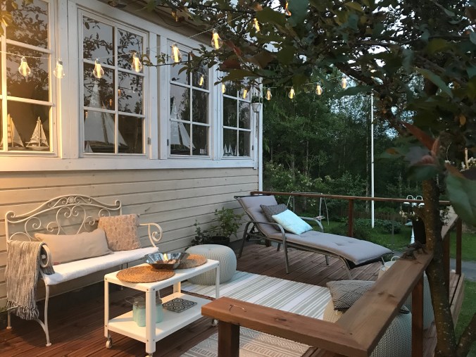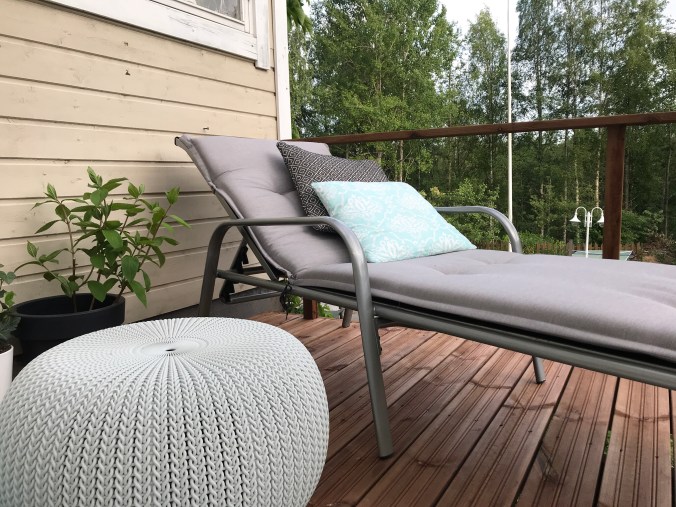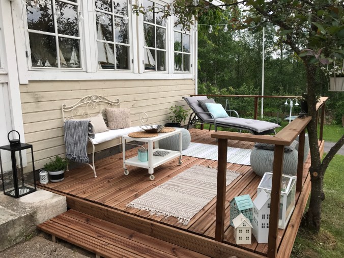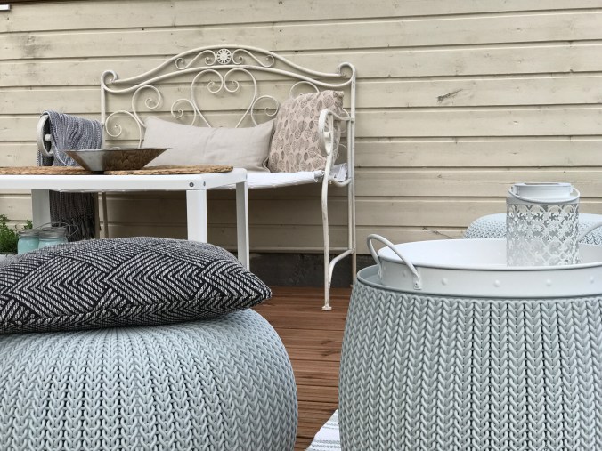Minulla ei ole mitään polyrottinki-sohvaryhmiä vastaan, mutta rajalliset säilytystilat ja budjetti laittoivat sille sisustuslinjalle pisteen. Lisäksi meillä on ruokaryhmä ja grilli jo takapihan vihermajassa, joten terassin käyttötarkoitus on puhtaasti viihteellinen; kirjan lukeminen, auringonotto ja musan kuuntelu. Elokuussa pimenevissä kesäilloissa saunan jälkeen istuskelu.