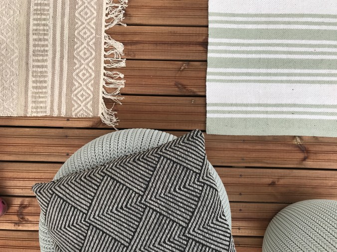 Pyrin hankkimaan yleensä kaiken kierrätettynä, mutta nyt ostin pari kalustetta uutena, koska kevään aikana sopivia ei löytynyt mistään. Muuten tekstiilit, ruukut jne ovat kirppiksiltä.