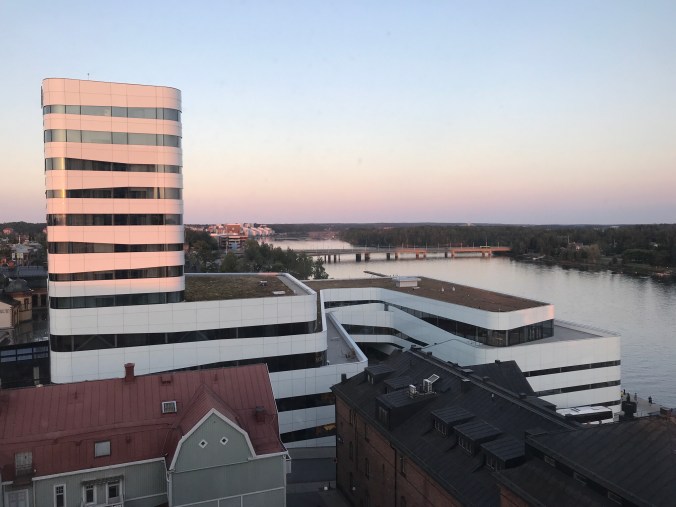 Nyt on pakko lukita tämä postaus ja painaa pää tyynyyn – ihan lopussa on oma ja puhelimen akku. Yön latauksella jaksaa taas uuteen päivään! Kiva näkymä on hotellin ikkunasta. Valkoinen rakennus on kulttuurikeskus!