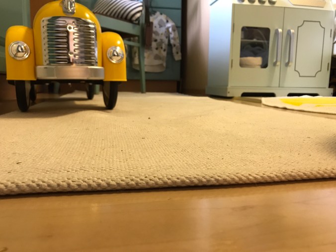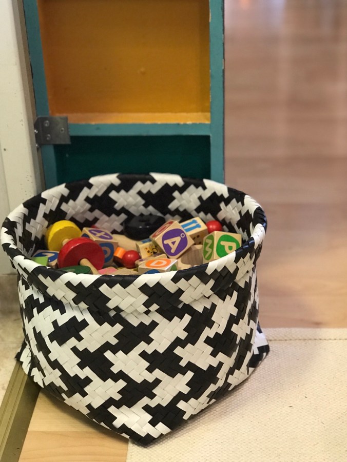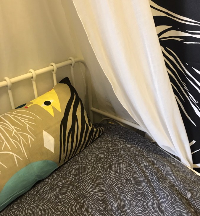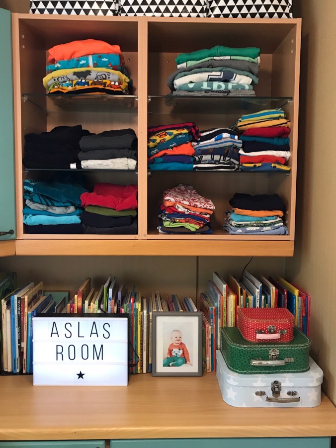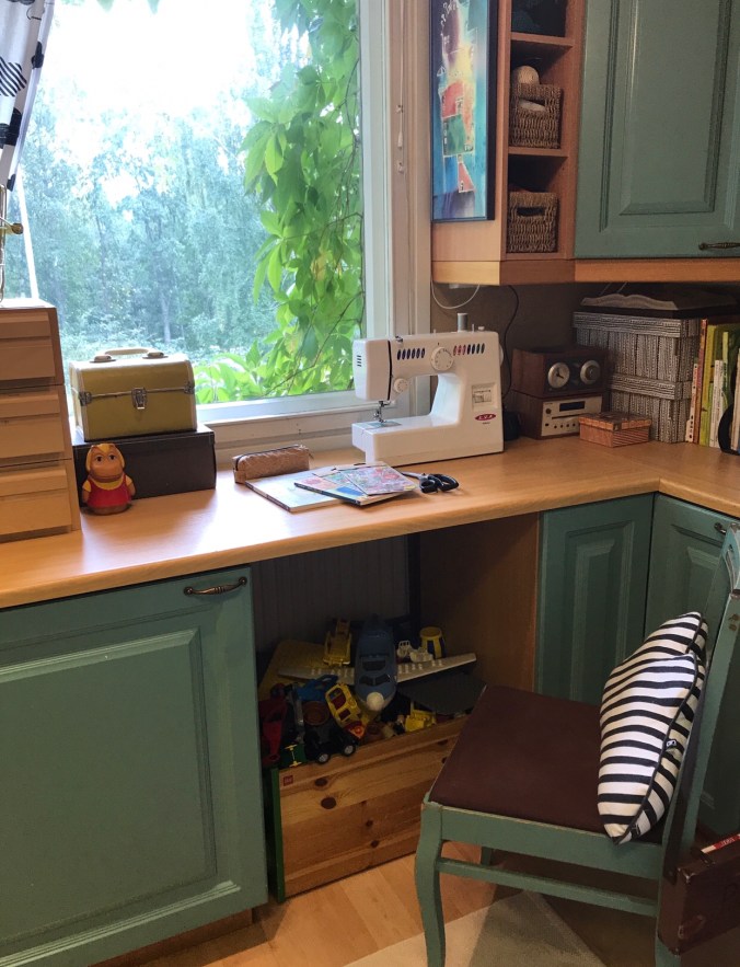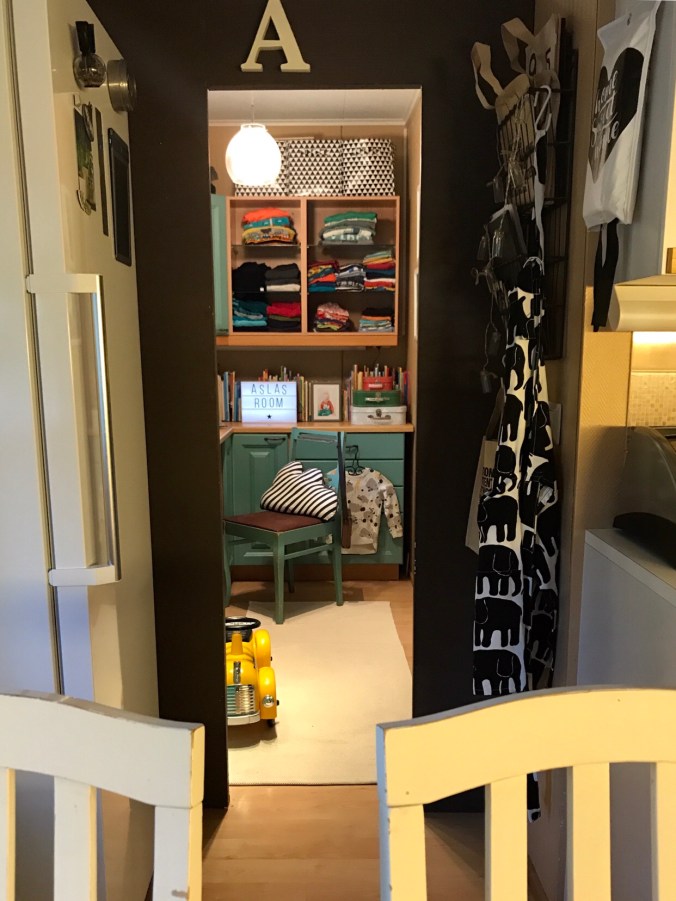 Työpöytä on sen verran korkea, että valtasin sen omaan käyttööni. Nyt voimme yhdessä puuhailla illalla omien projektiemme parissa; Asla pikkuautojen – minä tuunauksen, ompelun ja askartelun. Vaatekaappia ei tilaan mahdu, joten vaatteet on säilytettävä avohyllyillä. Ratkaisu pakottaa pitämään pinot suorassa..