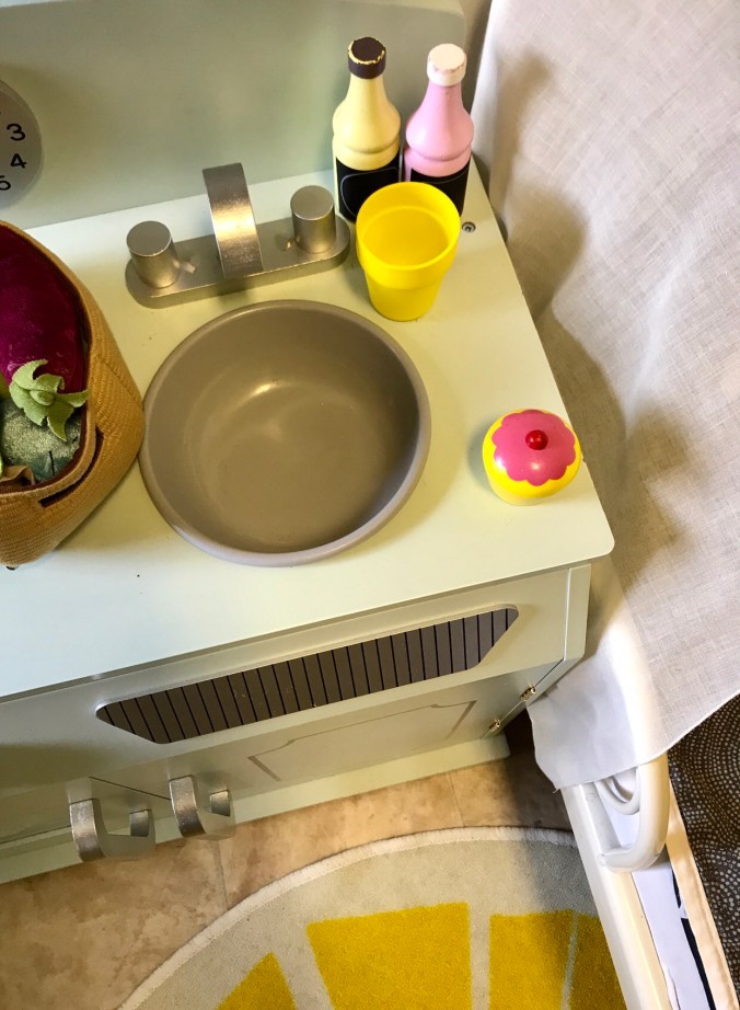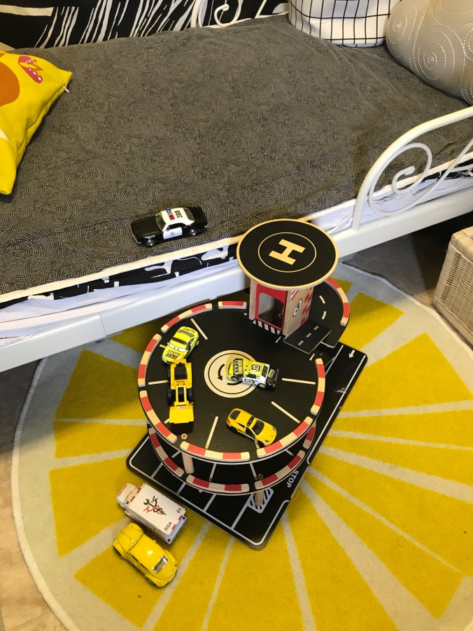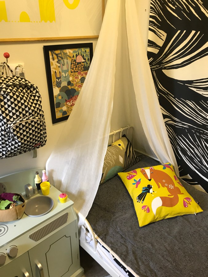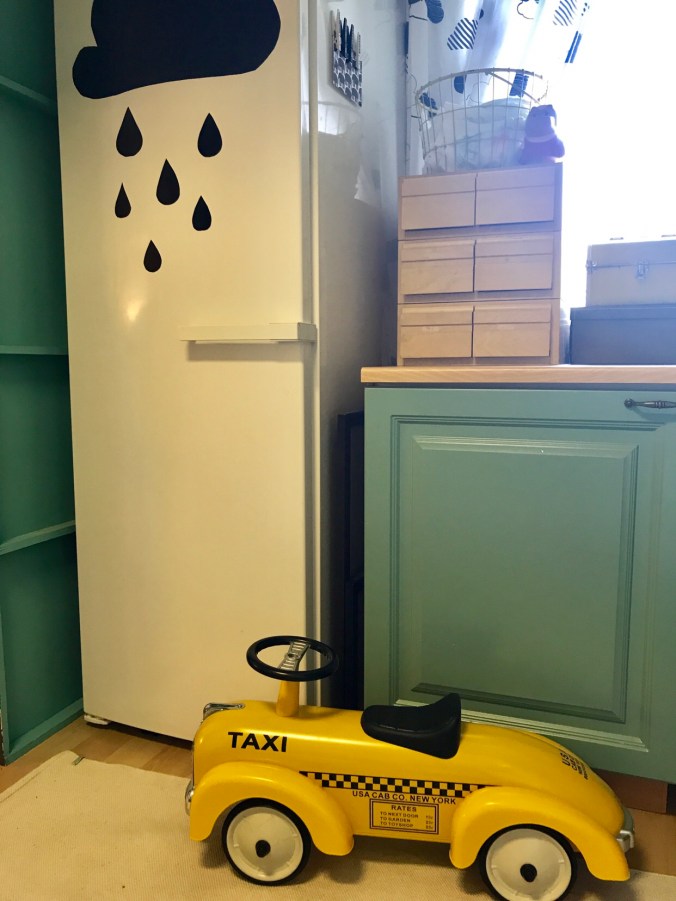 Nuorimmalla lapsistamme ei ole varsinaisesti omaa huonetta tilan puutteen vuoksi, mutta olen väsännyt hänelle leikkipaikan entiseen apukeittiöön, joka sijaitsee varsinaisen keittiön nurkassa. Kaapeissa on edelleen keittiön koneita ja nurkassa ruma pakastin, mutta ihan kelvollinen tila pikkupojan leikkeihin silti! Huoneeseen vie pikkuruinen kolo valeseinässä..