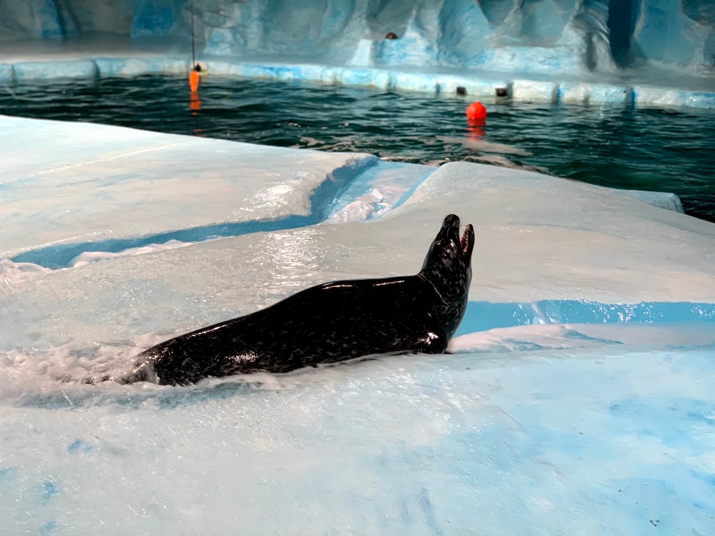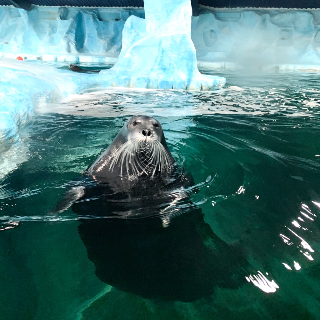 Polarian keskipiste on suuri hyljeallas, jossa suuret ja pienemmät asukkaat sukeltelivat vauhdikkaasti. Hylkeiden temppuilua pystyi seuraamaan sekä veden pinnalta että vedenalaisessa lasitunnelissa. Tietysti piti koittaa ottaa hieno kuva, mutta ei tullut onnistumista!