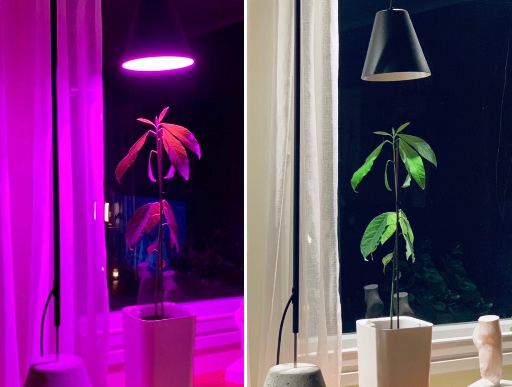 Syksyn pimetessä avokado sai kasvivalon, jonka avulla se selvisi pitkästä talvesta. Onhan tuo pinkki väri aika psykedeelinen, mutta oikeastihan se oli päällä vain 8 tuntia päivässä klo 8-16, eli illalla olohuoneessa ei ollut tuollaista pirtsakkaa valaistusta.